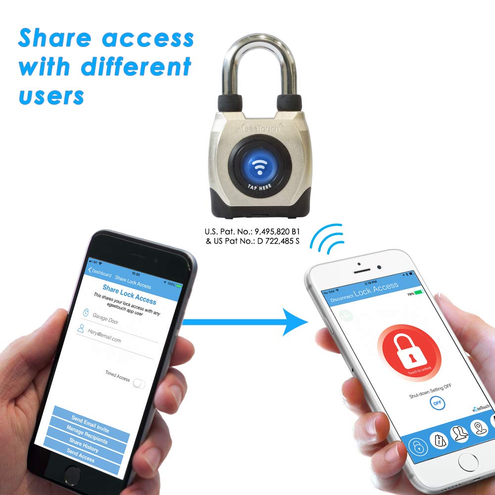 - PATENTED MULTI-ACCESS METHODS: (1) Simply press the shackle and tap on eGeeTouch® padlock with an eGeeTouch® NFC tag or (2) any Bluetooth paired smartphone (APPLE & ANDROID) or (3) Apple watch and Samsung Gear S2/3 for unlocking