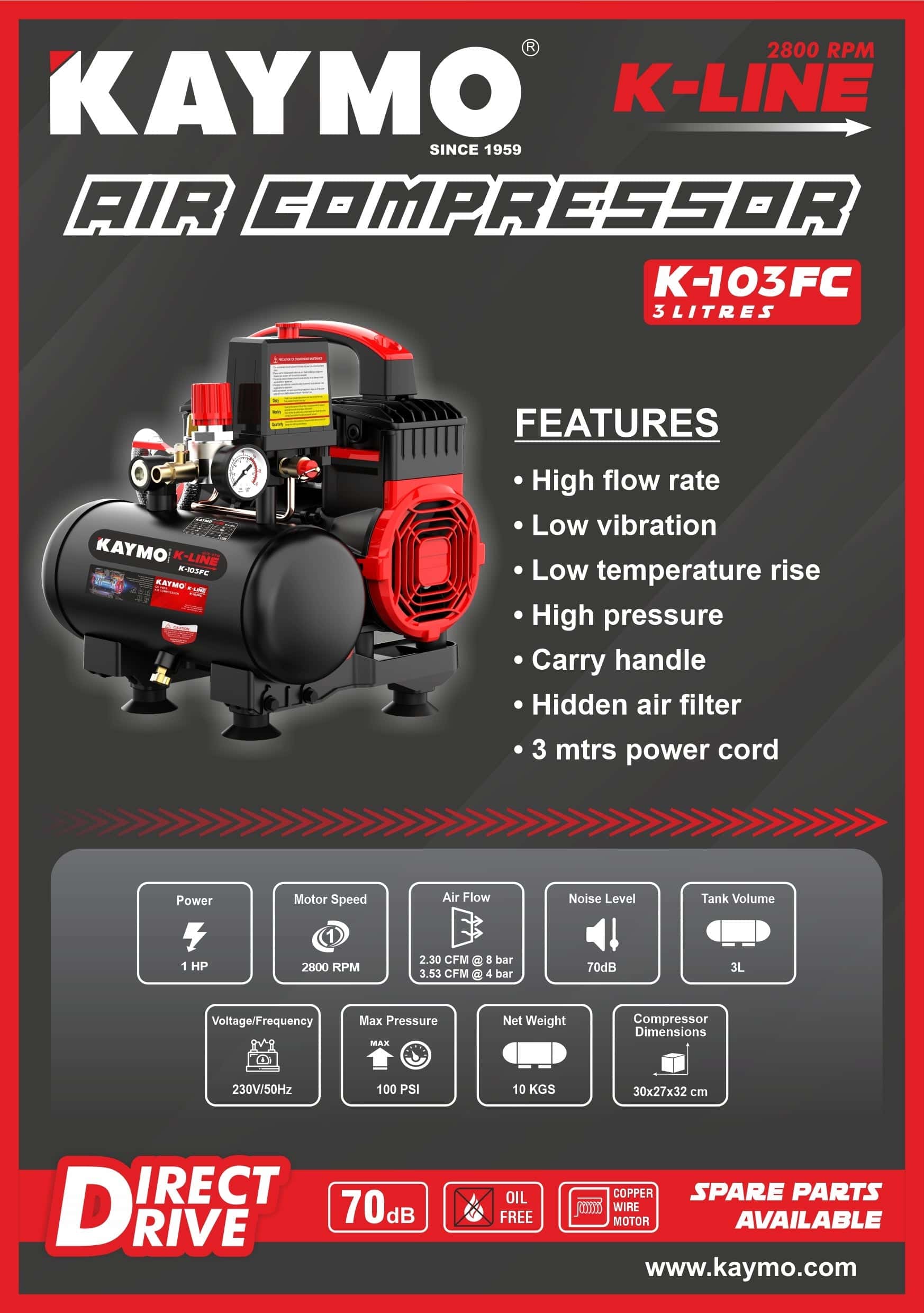 This is a KAYMO K-103FC Air Compressor from the K-Line series with a 3-litre tank and a direct drive system