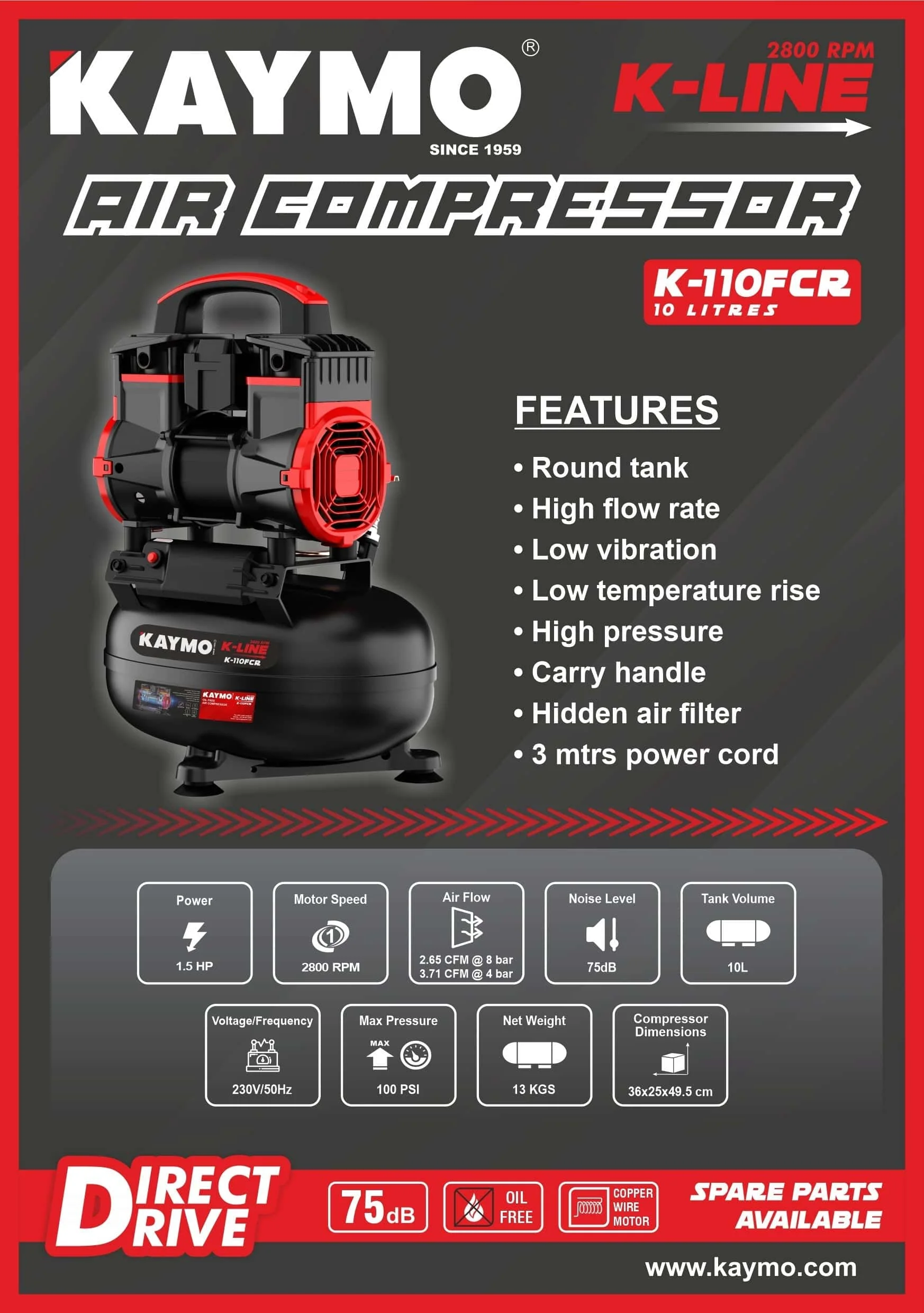 AIR COMPRESSOR KAYMO K-110FCR 1.5HP 10LTR OILFREE-COPPER ROUND TANK 2800 RPM