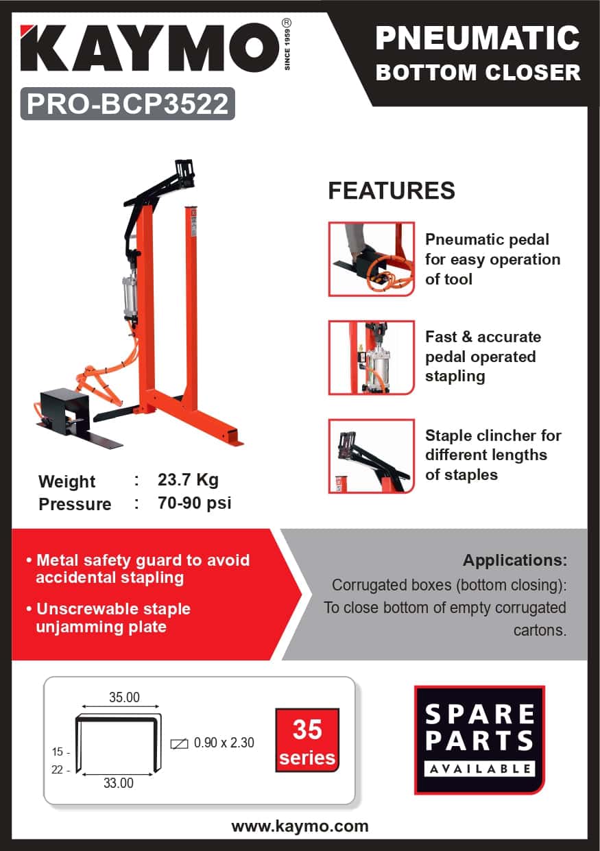 The KAYMO PRO-BCP3522 is a high-performance pneumatic bottom stapler, designed for securing the bottoms of empty corrugated cartons. Featuring a foot pedal operation and staple clincher adjustment, this tool ensures fast, efficient, and precise stapling in packaging environments.
