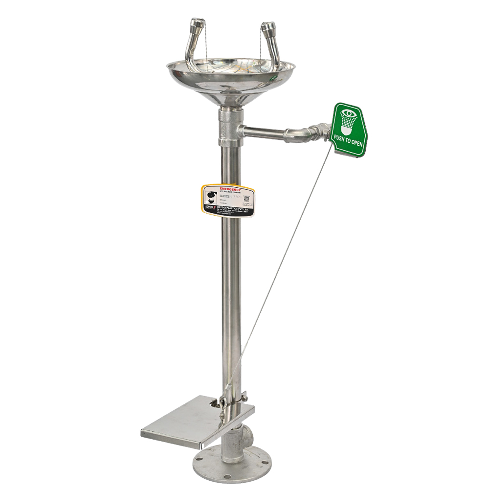 - With foot pedal for hands free operation to supply and control water flow through eye wash heads