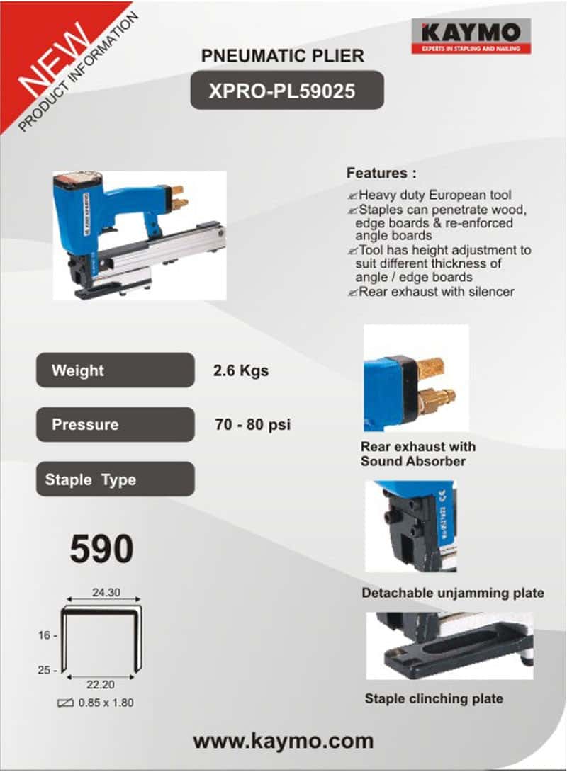 The XPRO-PL59025 Pneumatic Plier is a heavy-duty European tool designed for driving fastners that can penetrate wood, edge boards, and reinforced angle boards. Featuring height adjustment for varying thicknesses, it ensures a secure and reliable hold in packaging and woodworking applications