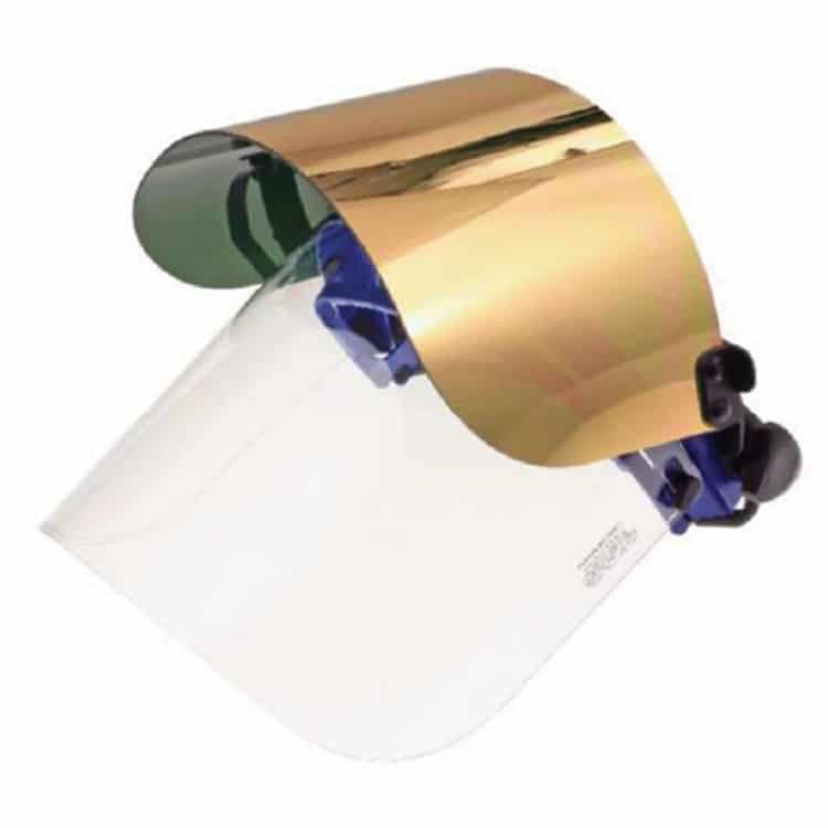 Face shield measuring 8” x 15 ½” x 0.060” with a 6” gold on shade 5 green hard-coated flip-front shield.
